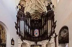The choir organ, placed in the south wing of the transept, was built in 1680 by Johann Georg Wulff and comprised 14 registers. In 1758 Johann Wilhelm Wulff conducted a thorough renovation of the organ, extending the disposition of the organ to 18 registers. In 1874, Carl Schuricht performed the organ restoration. In 1902 Berlin-based company of brothers Oswald and Paul Dinse carried out further reconstruction of the organ, introducing a pneumatic tracker action and reducing the number of registers to 14 (2 manuals and a pedal). When, in 1934–1935, Joseph Goebel was restoring the great organ, he also took care of the choir organ. It received a new electric tracker action and was connected to the main console. In 2003, a contemporary Emanuel Kemper 17-pipe organ with a mechanical and electric tracker action was imported from Germany. Afterwards, an organ builder Jerzy Kukla installed it in an antique organ case, replacing the previous instrument. The choir organ is at present connected with the great organ.