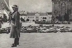 Under German occupation, the town was annexed directly into Germany. Poles from Olkusz were among the victims of a massacre committed in Celiny in June 1940. On 16 July 1940, in retaliation for the killing of a German policeman, the Germans carried out a massacre of 20 Polish hostages.[5] On 31 July 1940, the Germans gathered all Polish and Jewish men aged 15 to 55 and subjected them to torture and murder. The German terror campaign against the local population was aimed at the planned Germanisation of the town and the region.[6] The occupation ended in January 1945, and the town was restored to Poland.