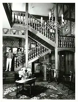 The flooring, doors and architraves are made of English oak and West Australian jarrah.[10][4] New Zealand kauri was used to construct the kitchen cupboards, dresser, and tables.[4] The oak stairs and gallery were made by joiners Green and Abbott in London, and then assembled on site, using no nails.[10] The printed hessian wallpaper in the hall was made by Turnbull and Stockdale of Lancashire, based on a Renaissance acanthus-leaf design.[4] The dining-room and library wallpaper were made by Birge and Co of Buffalo, New York. Stained-glass windows were provided by London firms Bryans and Webb, and G. F. Malins.[4] The drawing room contains the only decorated ceiling in the house.[4]