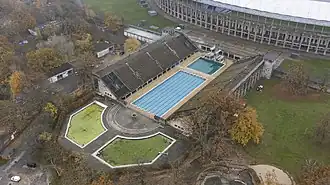 The stadium's ground level was constructed 13 ft (4.0 m) lower than the top part of the Olympic Stadium. Its swimming pool is 50 m long by 20 m wide, separated into eight lanes. Men's dressing rooms are located under the east stands while women's dressing rooms were located under the west stands. From the swimming pool's north end to the south end, the pool depth increases from 2 m to 2.30 m.