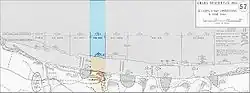 The German defensive preparations and the lack of any defense in depth indicated that their plan was to stop the invasion at the beaches.[5] Four lines of obstacles were constructed in the intertidal zone. The first, a non-contiguous line with a small gap in the middle of Dog White and a larger gap across the whole of Easy Red, was 250 m (270 yd) out from the highwater line and consisted of 200 Belgian Gates with mines lashed to the uprights. 30 meters (33 yd) behind these was a continuous line of logs driven into the sand pointing seaward, every third one capped with an anti-tank mine. Another 30 meters (33 yd) shoreward of this line was a continuous line of 450 ramps sloping towards the shore, also with mines attached and designed to force flat-bottomed landing craft to ride up and either flip or detonate the mine. The final line of obstacles was a continuous line of hedgehogs 150 meters (160 yd) from the shoreline. The area between the shingle bank and the bluffs was both wired and mined, and mines were also scattered on the bluff slopes.[6][7]