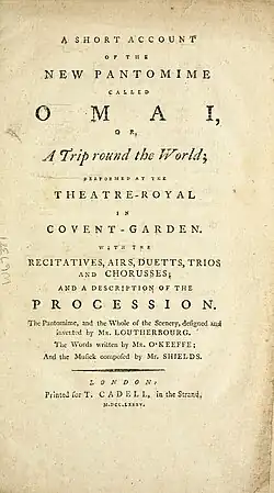 Omai is a 1785 pantomime written by John O'Keeffe with music by William Shield. It depicts the voyage of Omai, a Tahitian royal, to marry Londina the fictional daughter of Britannia. It was loosely inspired by the real visit of Omai to Europe in the 1770s and the final voyage of the explorer Captain James Cook leading up to his dramatic death in 1779. Its full name is Omai: or, a trip round the world