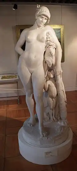In the Salon of 1887, Omphale was the centre of attraction in the garden of the Palais de l'Industrie.[1] Gérôme had seriously undermined his health by uninterrupted labour, having worked on the Omphale many days from seven in the morning till eleven at night.[2]