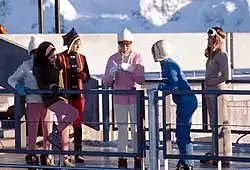 The avalanche scenes were due to be filmed in co-operation with the Swiss army, which annually used explosions to prevent snow build-up by causing avalanches, but the area chosen naturally avalanched just before filming.[35] The final result was a combination of a man-made avalanche at an isolated Swiss location shot by the second unit,[17] stock footage, and images created by the special effects crew with salt.[35] The stuntmen were filmed later, added by optical effects.[39] For the scene in which Bond and Tracy crash into a stock car race while being pursued, an ice rink was constructed over an unused aeroplane track,[25] with water and snow sprayed on it constantly. Lazenby and Rigg did most of the driving due to the high number of close-ups.[17]