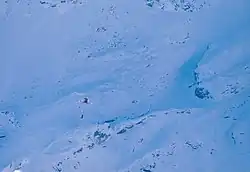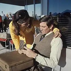 While the first unit shot at Piz Gloria, the second unit, led by John Glen, started filming the ski chases.[36] The downhill skiing involved professional skiers, and various camera tricks. Some cameras were handheld, with the operators holding them as they were going downhill with the stuntmen, and others were aerial, with cameramen Johnny Jordan – who had previously worked in the helicopter battle of You Only Live Twice — developing a system where he was dangled by an 18 feet (5.5 m) long parachute harness rig below a helicopter, allowing scenes to be shot on the move from any angle.[17] The bobsledding chase was also filmed with the help of Swiss Olympic athletes,[25][37] and was rewritten to incorporate the accidents the stuntmen suffered during shooting, such as the scene where Bond falls from the sled. Blofeld getting snared with a tree was performed at the studio by Savalas himself, after the attempt to do this by the stuntman on location came out wrong.[17] Heinz Lau and Robert Zimmermann served as the stunt doubles for Bond and Blofeld during the bobsleigh scene.[38] Glen was also the editor of the film, employing a style similar to the one used by Hunt in the previous Bond films, with fast motion in the action scenes and exaggerated sound effects.[25]