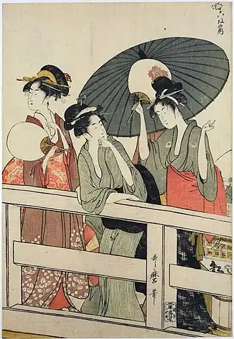 Ukiyo-e art flourished in Japan during the Edo period from the 17th to 19th centuries, and took as its primary subjects courtesans, kabuki actors, and others associated with the "floating world" lifestyle of the pleasure districts. Alongside paintings, mass-produced woodblock prints were a major form of the genre.[1] In the mid-18th century full-colour nishiki-e prints became common, printed using a large number of woodblocks, one for each colour.[2] A prominent genre was bijin-ga ("pictures of beauties"), which depicted most often courtesans and geisha at leisure, and promoted the entertainments of the pleasure districts.[3]