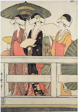 Nine elegantly-dressed[12] tall women[6] stand or lean on the bridge, watching the river flow beneath. Some hold hand fans or parasols,[12] suggesting a hot summer scene. The women come from different social rankings. From details such as the hairstyles some of the women are recognizable as geishas. The women in the upper left are women-in-waiting from a feudal lord's palace, and are wearing age-bōshi[b] head-dresses, which were popular during Japan's Edo period. A woman holding a child stands at the centre,[8] and to the right is a group of entertainers.[9] Behind the woman furthest to the right holding a round hand fan can be seen a water-seller's equipment; fresh water was scarce in the area, as it was made from reclaimed land by the ocean. Such merchants sold slightly sweetened water from distant springs.[6]