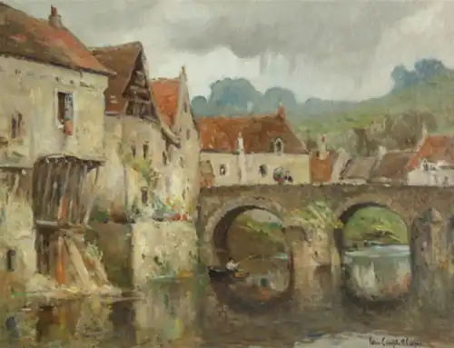 In addition to the painting "Port St. Jacques, Parthenay, France," Colin Campbell Cooper has another artwork titled "A View of a European Village." While it is uncertain whether this painting also depicts Parthenay, France, it is strikingly similar to "On a French River" in terms of its composition.[4]