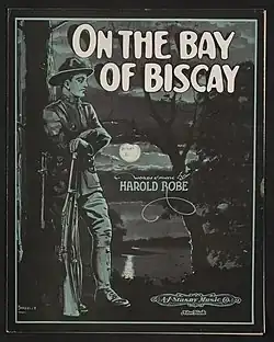 On the Bay of Biscay is a World War I-era song published in either 1918 or 1919; sources differ on the year.[1][2] Lyrics and music were written by Harold Robe. The song was published by A.J. Stansy Music Co. in New York, New York. Artist Albert Wilfred Barbelle provided the art for the sheet music. There are two versions of the cover, but both are similar. In one, a soldier is leaning against a tree, with his rifle beside him. The moon is shining over the water. In another edition, there is the sun instead of the moon, hovering above the water.[1] The song was written for both voice and piano.[2]