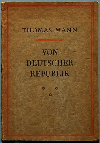 In his earlier Reflections of a Nonpolitical Man (1918), Mann had defended German authoritarianism and the "culture" of Germany against the "civilization" of the West.[4] After the establishment of the Weimar Republic, his speech "On the German Republic" marked a turning point for Mann as he now – at least in part – supported the young republic.[4]