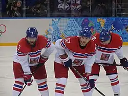 ![]() Palát (right) in February 2014 alongside Michael Frolík and Radko Gudas with the Czech men's national ice hockey team during the 2014 Winter Olympics. | ||