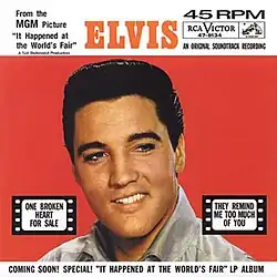 "One Broken Heart for Sale" is an Elvis Presley song taken from the soundtrack to the motion picture, It Happened at the World's Fair.[1] It was released as a single by RCA Victor on January 29, 1963.[2] "One Broken Heart for Sale" reached number 11 on the Hot 100 chart and remained on this chart for nine weeks. It was certified gold by the RIAA in 1992. It reached number 21 on the R&B chart and stayed on this chart for four weeks. In the UK, it peaked at number 12.