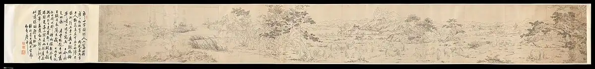 One Hundred Horses (Chinese: 百駿圖) is a Qing dynasty silk and ink painting by Giuseppe Castiglione. It was painted in 1728 for the Yongzheng emperor. The painting depicts a hundred horses in a variety of poses and activities, combining Western realism with traditional Chinese composition and brushwork.[1] Some of the horses are in a 'flying gallop' pose, which had not been done before by European painters.[2] The painting was executed using tempera on silk in the form of a Chinese handscroll. It was largely done in a European style in accordance with the rules of perspective, and with a consistent light source. However, the dramatic chiaroscuro shading typical of Baroque paintings is reduced and there are only traces of shadow under the hooves of the horses.[3]
