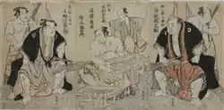 Another story tells that, after Onogawa became an official rikishi of the lord of the Kurume domain, he exterminated the ghosts that plagued the lord's domain at night by his boldness, as depicted in an ukiyo-e woodblock print produced by Yoshitoshi in his series on the 'One Hundred Ghost Stories of China and Japan'.[2][8]