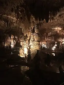 As this controversy raged Dill reopened Cathedral Cave, another cave on the property 11⁄2 times as long as Onondaga, under the name Missouri Caverns. New trails and lights were installed in the cave, and a large column formation within the cave was renamed the Liberty Bell in honor of the 1976 Bicentennial. The cave was closed soon after the defeat of the dam project in 1978. For several years it was subject to vandalism and theft that destroyed the lighting and visitor building.[6]