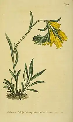 Onosma taurica, the golden-flowered onosma, is a plant native to Europe.[1] It is a perennial herbaceous plant.[2] The leaves are arranged in a rosette at the base of the plant and are often covered in dense hairs, which can give them a silvery or grayish appearance.[3]