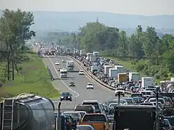 From Highway 401 to the Holland Marsh the freeway largely parallels the arterial/concession roads Weston Road and Jane Street, passing over the height of land at the Oak Ridges Moraine.[11] The highway passes through protected rural areas in northern York Region and encounters rolling countryside in Simcoe County south of Barrie.[10] Between Major Mackenzie Drive and King Road, Highway 400 features HOV lanes which have acceleration/deceleration lanes at entry/exit points.[12] Near the King City On-Route located between Kirby Road and King-Vaughan Road, Highway 400 will meet an under-construction Highway 413.[13][14] Just a bit north of the Simcoe Road 88 exit, Highway 400 will meet the future Bradford Bypass. The section near Barrie is subject to snowsqualls as it lies near the edge of Georgian Bay's snowbelt.
