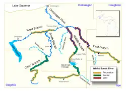 The Ontonagon River (/ˌɒntəˈnɑːɡən/ ON-tə-NAH-gən) is a river flowing into Lake Superior at the village of Ontonagon, on the western Upper Peninsula of Michigan in the United States. The main stem of the river is 25 miles (40 km) long[4] and is formed by a confluence of several longer branches, portions of which have been collectively designated as a National Wild and Scenic River.[5] Several waterfalls occur on the river including Agate Falls and Bond Falls.