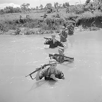 In total, approximately 25,000 OVW personnel would go to the East Indies,[2] of which 5,000 to 6,000 were assigned to the Mariniersbrigade and the rest to the Royal Netherlands Army. Five brigades were formed from this last group, the staffs of which were composed of officers from the Royal Netherlands East Indies Army. To the numbers mentioned must be added several thousand OVW personnel who served on ships of the Royal Netherlands Navy and with the Netherlands Naval Aviation Service in the Dutch East Indies. Later, the Oorlogsvrijwilligers were supplanted by much larger numbers of Dutch conscripts.[3]