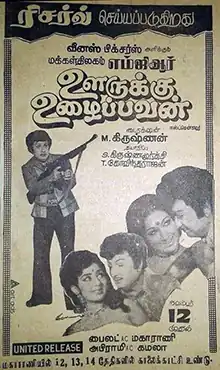 Oorukku Uzhaippavan (transl. Worker for the country) is a 1976 Indian Tamil-language film written and directed by M. Krishnan Nair, starring M. G. Ramachandran, Vanisri and Vennira Aadai Nirmala. It is a remake of the 1970 Kannada film Baalu Belagithu.[1] The film was released on 12 November 1976.[2][3]
