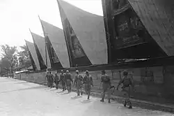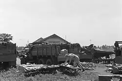Dutch paratroopers from Korps Speciale Troepen[12][13] landed at Maguwo airfield, which was defended by 47 lightly armed Indonesian Air Force cadets who lacked anti-aircraft machine guns. In advance, dummies were landed by the Dutch to draw enemy fire which enabled Dutch fighter planes to strafe the defenders.[1] The skirmish lasted for 25 minutes ending with the Dutch taking over Maguwo; killing 128 republicans with no casualties.[14] Having secured the airfield perimeter by 06:45, the Dutch were able to land airborne troops in two successive waves and use Maguwo as an airhead for reinforcements from their main base in Semarang.[1] At 8:30 am, General Spoor gave a radio broadcast ordering his forces to cross the Van Mook line and capture Yogyakarta to "purge" the republic of "unreliable elements".[1]