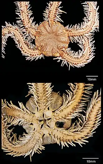 Ophiomastix venosa are morphologically distinct for various reasons. Brittle stars, including O. venosa, have unique body plans; they exhibit pentaradial symmetry (five-point symmetry), with five 'serpent-like' arms that connect to a distinct central disk. Each of the arms are covered in spines that aid in locomotion, feeding, and defense.[5] The Ophiomastix venosa species is recognized by their enlarged upper arm spines, which are covered by a thickened epithelium, and the absence of or extremely minute scales on their central disk.[3] O. venosa exhibit claviform arm spines, meaning that specialized spines along the perimeter of their arms are enlarged and thickened.[3] These enlarged arm spines may be described as 'club-shaped'.[3] These claviform arm spines do not align with the adjacent spines on the opposite vertical series; the alternating pattern of claviform arm spines is 2/3 for O. venosa.[3] The claviform arm spines of O.venosa, are distinguishable to the species as they are also furcated, meaning that there are cloven projections along the tips of their enlarged arm spines.[3]