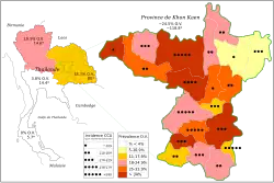 Opisthorchiasis is prevalent where raw cyprinid fishes are a staple of the diet.[19] Prevalence rises with age; children under the age of 5 years are rarely infected by Opisthorchis viverrini. Males may be affected more than females.[20][21] The WHO estimates that foodborne trematodiases (infection by worms or "flukes", mainly Clonorchis, Opisthorchis, Fasciola and Paragonimus species) affect 56 million people worldwide and 750 million are at risk of infection.[22][23] 80 million people are at risk of opisthorchiasis (67 million from infection with Opisthorchis viverrini in Southeast Asia and 13 million from Opisthorchis felineus in Kazakhstan, Russia, and Ukraine).[24][25] In the lower Mekong River basin, the disease is highly endemic, and more so in lowlands,[19] with a prevalence up to 60% in some areas of northeast Thailand. However, estimates using polymerase chain reaction-based diagnostic techniques indicate that prevalence is probably grossly underestimated.[26] In one study from the 1980s, a prevalence of over 90% was found in persons greater than 10 years old in a small village near Khon Kaen in northeast Thailand in the region known as Isan.[27] Sporadic cases have been reported from Malaysia, Singapore, and the Philippines.[23] Although the overall prevalence has declined since initial surveys performed in the 1950s, an increase has occurred since the 1990s in some areas, possibly related to large increases in aquaculture.[25]