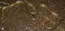 When preserved in 70% ethanol, the upper side of the head and body surface are dark brown and the underside is yellowish-beige. The dorsal scales have a light yellow blotch in the center, which become wider towards the side of the body. The tail scales on the underside also have light central blotches, while the underside of the head has indistinct light mottling, more obvious on temporal scales. The supralabial scales have a light blotch, and the infralabial scales, chin shields, and smaller throat scales in front of the ventral scales are light yellow with brown mottling or blotches. The belly has some scattered dark flecks and the outermost edges of light ventral scales are brown. The subcaudal scales turn light yellow with black towards the front and sides.[2]
