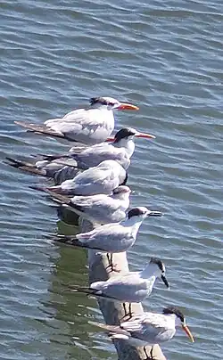 Orange-billed tern is a colloquial name applied to a group of four large terns in the genus Thalasseus with orange bills, which are quite similar in appearance and often considered difficult to identify, namely: