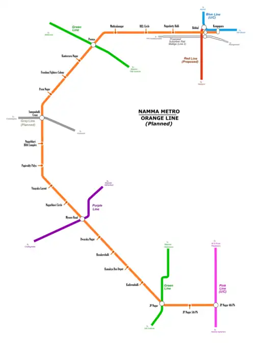 The Orange Line is an upcoming metro line serving Bangalore as part of the Namma Metro network in the city. This metro line will serve the industrial areas,[a] manufacturing units,[b] educational institutions,[c] providing connectivity to the southern part of the city,[d] thereby improving last-mile connectivity to commercial centres, industrial hubs, educational institutions, and healthcare facilities.[1][2] The line was approved by the Union Cabinet on August 17, 2024 and is scheduled for completion in 2029.[3][4][5][6][7][8]