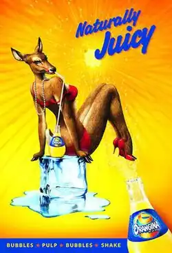 In 2008, a television commercial featuring anthropomorphic animals (such as a deer, a bear, peacocks, and chameleons) in swimsuits, caused outrage in the United Kingdom, for its sexually suggestive content. In the video, the animals gyrate around poles, spray the drink onto the breasts of other animals, and ride bottles which then explode. The advert had already had 45 seconds of more provocative footage cut, and was only to be shown after the 9 o'clock watershed, initially during a programme titled How to Look Good Naked. Kidscape, a children's charity based in the country, criticised the advert, saying, "Orangina is a drink which is mainly aimed at children and young people, but this new advert places the product in a very sexualised and provocative context".[20] The advert was also awarded "Freakiest Advert of 2007", and was seventh place in "Worst TV Ad of 2008".[21][22] Others asserted that Orangina is not targeted just at children and is also a "leading adult soft drink"[23] and that the advertisement is intended to create controversy and thus free publicity.[24] The advertisement was popular, and by April 2008 had three million online viewings.[23]