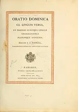 Oratio Dominica CL Linguis Versa (Italian: Il Libro di Preghiere Della Domenica) is a book written in Latin by Jean-Joseph Marcel.[1] This work was printed in 1805 to honor the visit of Pope Pius VII to France for the coronation of Napoleon in 1804,[2] using types that had been taken out of Italy after Napoleon's invasion in 1796. It contains the Lord's Prayer printed in 150 different languages and dialects. The book is divided alphabetically, and by geographic continents, comprising Asia, Europe, Africa, and the Americas. The section on the Americas shows nineteen Native American languages.[3]