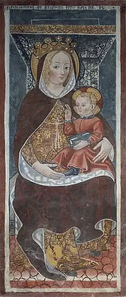 Examining the inscription Alaxina uxor Baltramini fecit fieri, the critic proposed that the work was an ex-voto through which Alaxina implored the Madonna for a grace in favor of her little son, portrayed kneeling in the clothes of a little friar.[25] |