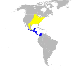 The nominate subspecies' winter range extends from the coastal lowlands of central Sinaloa and southern Veracruz south to northern Colombia and northwestern Venezuela (Scharf and Kren 1996). The ochre subspecies has been observed in winter on the Pacific slope of Mexico.[3]