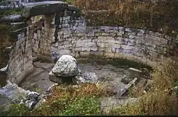The Tomb of Minyas is one of the greatest burial monuments of the Mycenaean period.[28] The tomb was probably built for the members of the royal family of Orchomenos in 1250 BC and was plundered in antiquity. The monument was visible for many centuries after its original use and even became a place of worship in the Hellenistic period. It was probably a famous landmark until at least the second century AD, when Pausanias visited Orchomenos and described the tholos in detail.[29] It had a dromos thirty metres long. Its entrance was built of dark grey Levadeia marble and had a wooden door. The lintel, still in place today, is six metres long and weighs several tons. The entrance and the chamber were decorated with bronze rosettes as shown by the attachment holes on the walls and the ceiling of the side chamber is decorated with spirals and floral motifs in relief. In the centre of the Tholos, a rectangular burial monument dates to the Ηellenistic period (323–30 BC). It was partially restored by the architect-archaeologist A. Orlandos. In 1994, the Hellenic Ministry of Culture undertook restoration work consisting mainly of drainage and strengthening of the walls of the side chamber.