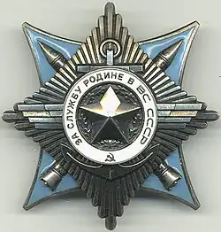 The Order "For Service to the Homeland in the Armed Forces of the USSR" (Russian: Орден «За службу Родине в Вооружённых Силах СССР»), also known as the Order "For Service to the Motherland in the Armed Forces of the USSR", was a Soviet military order awarded in three classes for excellence to military personnel.