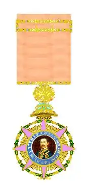 Insignia consists of a pendant only. The pendant design is similar to that for a Knight Commander, but of smaller size. It is suspended from a pink silk band 4 cm wide, with an additional rosette, to wear on the left chest.