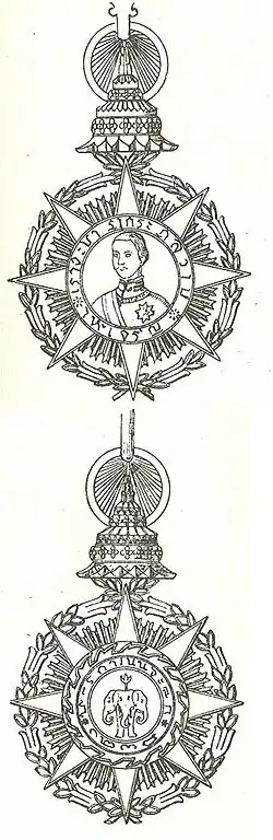 • Medal - The medal, also known as the 'Junior Companion', is a silver disc. The central piece bears a portrait of King Rama V and is surrounded by a raised band, engraved with the motto "I Shall Maintain My Royal Family". The whole piece is edged with a wreath and topped with a crown with a starburst. The reverse of the medal is engraved with Airavata elephants bearing the Trident and Thai script. The whole piece is surrounded by a Chakra and gold wreaths. The medal is suspended from a pink silk band of 4 cm wide, to wear on the left chest.