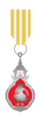 Design: silver breast badge (Obverse: in center, silver figure of the King of the Monkey Army (Hanuman) clutching sword, on red enamel background, surrounded by frieze of small ribbon like protuberances, and at top fixed Royal Lao Crown suspension; Reverse: plain), 34mm across, with suspension ribbon. Ribbon: 36mm; orange yellow 7mm, white 3mm, orange yellow 6½mm, white 3mm, orange yellow 6½mm, white 3mm orange yellow 7mm; Service bar – without rosette.