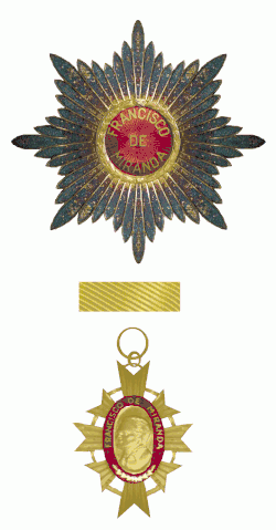The Order of Francisco de Miranda (Orden Francisco de Miranda) is conferred by the Republic of Venezuela in memory of Francisco de Miranda (1754–1816). This national honor and decoration was created to recognize Venezuelan citizens and foreigners who have contributed to the sciences, to the progress of the country, to the humanities or who have exemplified outstanding merits.[1] There are several variations in this Order.[2] This Order was originally a medal, established in 1934; however, it was established as an Order on July 28, 1939.[3]