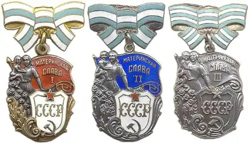 The Order of Maternal Glory (Russian: Орден «Материнская слава», romanized: Orden "Materinskaya slava") was a Soviet civilian award commemorating mothers with a substantial number of children, created on 8 July 1944 by Joseph Stalin and established with a decision of the Presidium of Supreme Soviet of the USSR. Its status was confirmed by the Soviet's decision of 18 August 1944 and later modified by 16 September 1947, 28 May 1973 and 28 May 1980 decisions. It was awarded on behalf of the Presidium of the Supreme Soviet of the USSR through decrees of local Soviet presidencies.[1]