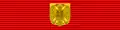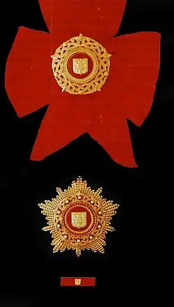 The Law did not give detailed description of the insignia of any decorations, but gave the Government mandate to do so.[4] The Government adopted a Decision of 17 June 1999 with precise descriptions of the orders and medals, but the Order of Yugoslavia was not mentioned in that decision.[3][5] The Order of Yugoslavia's insignia was precisely described only in the new Government's Decision of 27 July 2000.[6] The star of the order has five points, and on it is a folk ornament made of gold in the form of a wreath with embedded gems. The central part of the ornament is framed by a golden circle decorated with rubies. The circular base in the center is covered with transparent red enamel on which is the golden coat of arms of the FRY. The grand collar is made of gold it consists of 20 chain pieces that alternately bear the coat of arms of the FRY, and the central piece has engraved laurel branches decorated with four gems.[6][7]