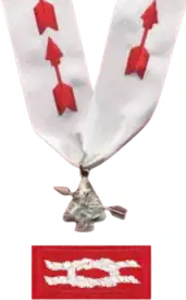 Since the time of the first awards in 1940, fewer than 1,200 Distinguished Service Awards have been presented.[8] The award itself is a sterling silver arrowhead, bearing an arrow pointing upward and to the wearer's right, suspended from a white neck-ribbon upon which are embroidered red arrows (the first awards were suspended from a forest green ribbon – the current ribbon has been in use since the 1960s). A white square knot embroidered upon red cloth is available for uniform wear, and a miniature silver arrowhead lapel pin is available for civilian wear.[9]