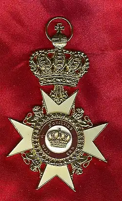 The grand-cross was a silver 8-pointed star in whose middle was a reduced cross in a medallion with a circular motto in the centre. Sovereigns received the star in gold. The Komtur (since 1889 no longer of the Komtur with star) had a 4-pointed silver star whose rays went through the cross angles.