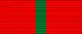 The order, using an eyelet and a ring, is connected to a pentagonal block, covered with a red moire ribbon with a longitudinal green stripe in the middle for the order of the 1st degree, two green longitudinal stripes along the edges for the order of the 2nd degree, two green longitudinal stripes along the edges and one green longitudinal stripe in the middle for Order of the 3rd degree.