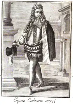 The Order of the Golden Spur[1] (Italian: Ordine dello Speron d'oro, French: Ordre de l'Éperon d'or), officially known also as the Order of the Golden Militia (Latin: Ordo Militia Aurata, Italian: Milizia Aurata),[2] is a papal order of knighthood conferred upon those who have rendered distinguished service in propagating the Catholic faith, or who have contributed to the glory of the Church, either by feat of arms, by writings, or by other illustrious acts. With the death in 2019 of the last remaining knight, Grand Duke Jean of Luxembourg, the order is considered dormant.