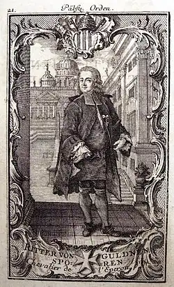 By the mid-18th century the Order was being so indiscriminately bestowed that Casanova remarked "The Order they call the Golden Spur was so disparaged that people irritated me greatly when they asked me the details of my cross;"[9] he had the grace to add that he would have been pleased if he had been able to answer "mon Toison", and he did habitually wear it, nevertheless, on its scarlet riband. In 1777 Wolfgang Amadeus Mozart had his portrait painted with the star-encircled cross of the order on his coat,[10] and the Order granted to Giovanni Battista Piranesi permitted him to sign his etchings Cav. G.B. Piranesi. The Order was granted to "those in the pontifical government, artists, and others, whom the pope should think deserving of reward. It is likewise given to strangers, no other condition being required, but that of professing the catholic religion."[11]