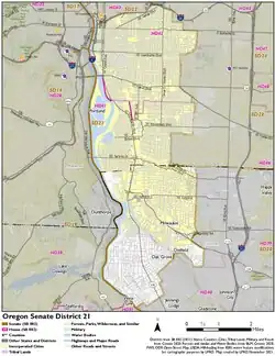 Oregon's 21st Senate district comprises parts of Clackamas and Multnomah counties, including Milwaukie and Oak Grove as well as parts of southeast Portland in the U.S. state of Oregon. It is composed of Oregon House districts 41 and 42. The district is currently represented by Democrat Kathleen Taylor of Portland.