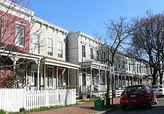 Important Quakers who lived in the Oregon Hill neighborhood included Robert Pleasants,[5] and later Samuel Pleasants Parsons, who became superintendent of the Virginia Penitentiary, which once stood on Belvidere Street. As General Superintendent of the canal company, Parsons oversaw its expansion to Lynchburg, Virginia.[6] In 1817, the Harvie family, which owned most of the neighborhood, subdivided it into lots, which were sold to blacks as well as whites. The Baker House, built by a "free person of color" on Belvidere Street c. 1850, was moved in the 1920s to 617 Cherry Street.[7] The neighborhood's name refers to quips that employees moving there to be close to their workplace might as well be moving westward to Oregon. The Tredegar Iron Works and Albemarle Paper Company became major employers by the 1850s. In 1849, the Hollywood Cemetery was developed from what had been known as Harvie's Woods at the edge of the neighborhood.