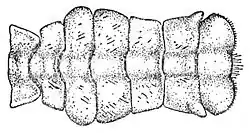 The carapace is somewhat oblong in shape, about three-fourths as wide as it is long. It is slightly narrower at the anterior end. Two small spines are present at the posterior margin of eye orbit (the postorbital spines). The basal segments of the antennae are narrow and have small and stout forward-pointing spines, with smaller spines on the outer and inner margins. The rostrum is divided into two short, flat, and gradually tapering horns, hence the common name "split-nose". They measure about 5 mm (0.20 in) long in males and 3.4 mm (0.13 in) long in females, and are similar in shape to the postorbital spines. The upper and lower surfaces of the body covered densely with small protuberances (tubercles) with soft and long yellow hairs that curve at the tip.[4][5] The abdomen (pleon) is composed of seven distinct segments.[3]